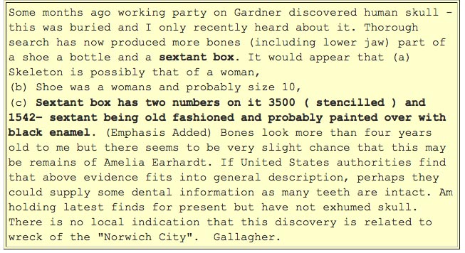 While researching the Kiribati National Archives in Tarawa in 1997, TIGHAR member Peter MacQuerie discovered a formerly secret file labeled "Discovery of Human Remains on Gardner Island" which contained 15 official telegrams and one letter regarding the discovery of a partial skeleton on Gardner Island in 1940. Contained was the following: