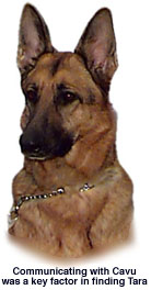 Communicating with Cavu was key in choosing Sally and Rick's second Shepherd, Tara. Sally, Rick and Cavu had discussed getting another dog and Cavu thought it was a great idea. The three of them decided to call the new dog "Spirit of Friendship." "We looked at a few litters, but Cavu wasn't impressed," said Sally. "As soon as we saw Tara, it was instant friendship and we knew it was the right dog. "This is 'Spirit,' Cavu said. After we bought Tara we found out that her full name was 'Tara Kindred Spirit.' Tara and Cavu get along perfectly and are the best of friends."
