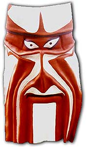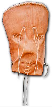 Coffey creates the masks from pieces of leather in a process that is almost "magic." "They pretty much just happen..." confesses Coffey. "The ideas that I have when I begin are seldom present in the result. What I create is something that seems to come through me and express itself. The drying of the leather allows the mask to really take a form of its own." His creations, 2 to 3 feet tall, are not representative of any specific religion, culture or ceremony, but they do seem to have an almost "esoteric" quality. Even if you're not a collector of tribal or cultural art pieces, the color and shape of these strange creations are temptation enough to make you want to own one. You can contact the artist at:lhcoffey@aol.com. |