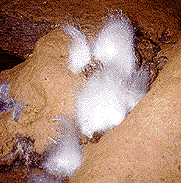 Paul has a good sense of humor-- something vital in this sport. The photograph on the left is of "raccoon turds," which Paul likes to photograph after the fungi and molds in this dark world have decorated them with what looks like "angel hair." His short stories and actual adventures reflect his deep thoughts and the reality of the dangers of caving. He contemplates the fatal consequences of even a minor physical injury or of getting lost with a companion and fantasizes about the necessity of eating human flesh to survive such an accident.