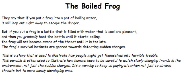 The frog that has been sitting inside the pot, on the lit stove, is now pretty hot. But does not remember what it was like some time back, though something is definitely not quite right. The frog is you, José. No way, you say? You are essentially living in an asylum, which is not as bad as it sounds, however: someone is going to light up the asylum, and the toolbox to do it is well-sorted, and what is worse, the exit doors are chained shut. And second: you are one of a million people who come to this place regularly, and we won't say in what timeframe to not spoil the low-key attitude, and not wake up the bad dogs. That is quite a lot you may say, but then, this is a global zone, inhabited by a network of curious people, and I mean this in both ways: curious as people individually, and curious about other things, and I don't mean checking facebook. Some of you frogs may want to jump out of the hot pot, and soonly.