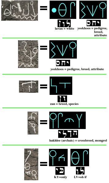 This particular collection is located on private land. It is in the "cursive" style where individual letters are combined and are read from right to left, from top to bottom. Although there is not enough translation completed at this writing to determine the specific message, the multiple references to "breed" and "pedigree," as well as references to fleeing from "poisonous powder" (dust) and "painful light," is quite interesting and suggest either a prophecy, or an event in the history of the authors.