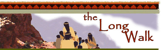 After many months of bitter imprisonment, about 8,000 men, women and children were forced to make a grueling 300-mile forced march, remebered as "the Long Walk," across New Mexico to a dry desolate strip of land known as Bosque Renondo. There, Carleton invisioned, they would become "happy and contented people."