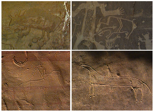 The Plains Indian art we will be encountering in Colorado will be similar. It will contain numerous clues as to the recent origin of these markings, such as the depiction of horses (brought by the Spanish in the 1600's) and of White Men (usually depicted with cowboy style hats) and rifles. We mention this because these petroglyphs were often drawn on the same stone walls as the much earlier abstract art and, most importantly, the alphabetical writing that we will be examining. Some prime examples of Plains Indian petroglyphs are shown below. Note that they seem to be inscribed or scratched into the rock rather than pecked, as many of the older glyphs are made.