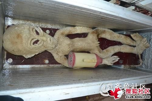 Public three months ago in the Yellow River Lee with grid electricity rabbit, met five riding UFO aliens, electricity after the death of one, was his collection in their own warehouse. The body length of 1.9 m, 45 kg, the head is large, there is a video picture. Lee also said that during the two experts who came to his house looked alien, "they say the DNA of the organism and the Earth is not the same person."