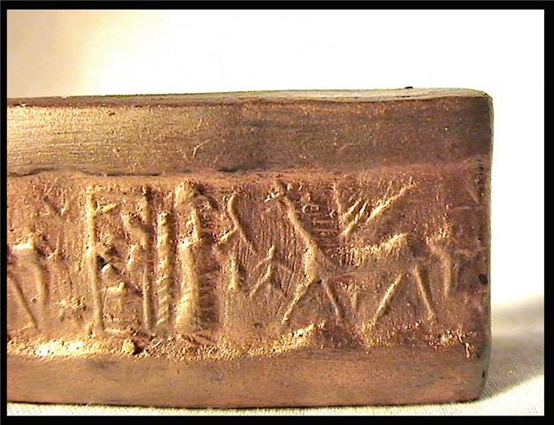Replica of a 2100 BC engraved seal found along the old trade route which snakes through northern Iran. Seals of this type, with simplified graphic designs depicting archaic myths and mythic creatures, typify the revival of Sumerian culture following the Akkadian collapse around 2100 BC.