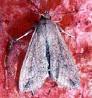 Army worms are the larvae of moths [right]. The female mothd lay eggs on leaves and leaf sheaths near the ground. These eggs hatch within a few days and initially the larvae, armyworm, feed close to where they hatch. The larvae are found in cracks in the soil or under rocks during the day, feeding at night or early in the morning. In damp weather, they may feed all day. Larvae are generally omnivorous in attacking grasses. Species of these insects are found in most cereal-growing areas of the world. Armyworms sporadically cause severe damage; when they do, they can devastate large areas.