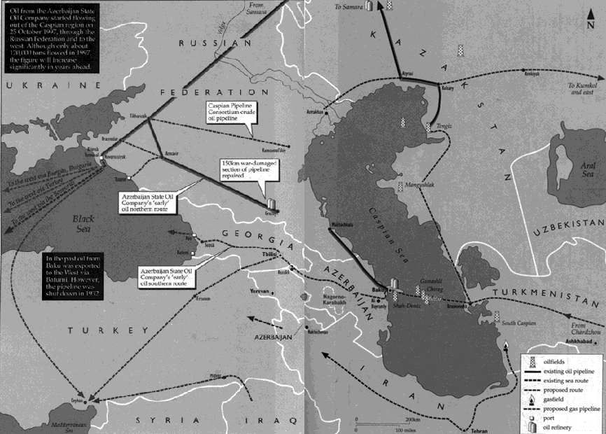 The undersea pipeline crossing the Caspian Sea now existed on the drawing table, but in the waters the five surrounding countries (Azerbaijan, Russia, Kazakhstan, Turkmenistan, and Iran) had not yet come to an agreement about each other's borders, and thus about the ownership of oil fields. As long as this would last, according to an existing agreement of 1940, Russia and Iran would have to agree with the pipeline under the sea. And they did not. [44]