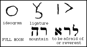 Many of the translations reveal a rich spiritual life, devoted to the deity "Yah." But many of the other petroglyphs appear to have been used as signs for the inhabitants and visitors to the area. The panel on the right is an example of what might be considered a sign or posted notice. This particular group of symbols shows that the symbols could be read from bottom to top (as with the ligature) and includes a ideogram (a circle) commonly used to represent the full moon.