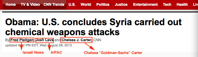 ![]() [click for larger photo] Secretary of State John Kerry opened his speech Friday, August 30, 2013, by describing the horrors victims of the chemical weapon attack suffered, including twitching, spasms and difficulty breathing. Attempting to drive the point home, Kerry referenced a photograph used by the BBC illustrating a child jumping over hundreds of dead bodies covered in white shrouds. The photo was meant to depict victims who allegedly succumbed to the effects of chemical weapons via Assad's regime. However, it was later exposed the photograph used had been taken in 2003 in Iraq. It was not related to Syrian deaths whatsoever and was later retracted. A Video We Cannot Show You Because advertisers don't want to upset you, we have to work under a form of censorship. It's kind of hard to show what's happening in a war with happy, smiley faces... so here is the link to an important video you should watch: http://youtu.be/BLAMVtLq2V0 [We're not allowed to make the link active.] Some Advice... Don't trust the main stream media. They buy their news "packages" from public relations firms who receive funding from the likes of AIPAC [*] and other politically motivated organizations. That is... when they are not just making it up (see below).