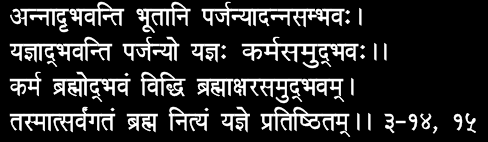 "All the living-beings have evolved from food; the production of food is dependent on rain; rain ensues from sacrifice, and sacrifice is rooted in prescribed action. Know that prescribed action has its origin in the Vedas, and the Vedas proceed from the indestructible; hence the all pervading Infinite is always present in sacrifice." (Gita 3-14, 15)